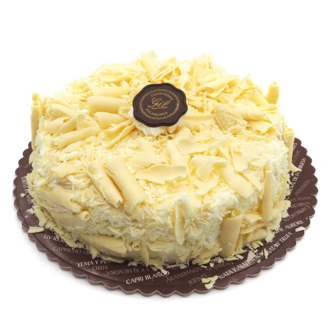 Tarta de bizcocho, nata y cobertura de chocolate blanco.