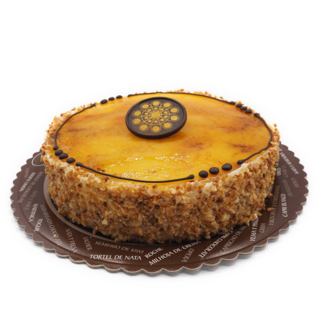 Exquisita tarta elaborada con una base de bizcocho de almendra , nata y crema pastelera; decorada con yema y almendra.